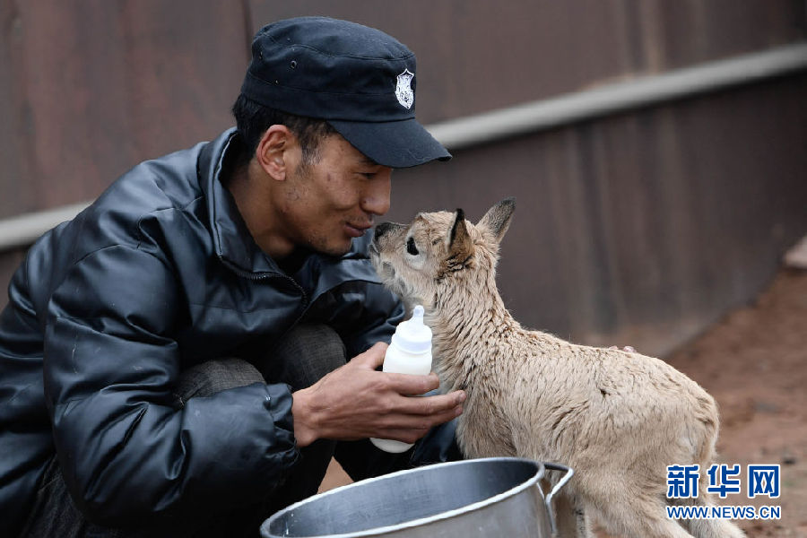 7月7日,三江源國(guó)家公園管理局長(zhǎng)江源園區(qū)可可西里管理處卓乃湖保護(hù)站的工作人員才文多杰在給藏羚羊幼仔喂奶。新華社記者 薛玉斌 攝