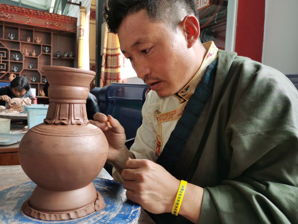“我從小看著老藝人做黑陶,長(zhǎng)大也成了黑陶手藝人。如今,不少人靠黑陶過上了好日子?!鼻嗪S駱洳刈遄灾沃菽抑t縣吉曲鄉(xiāng)山榮村古陶器傳承工程中心負(fù)責(zé)人才角仁增說。