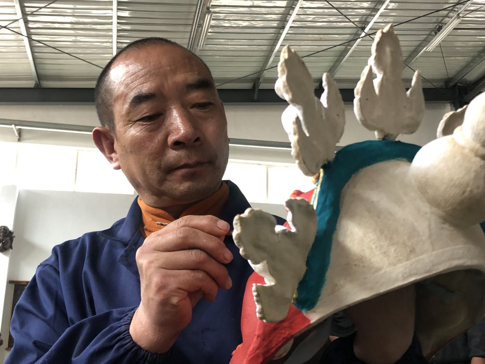 青海玉樹藏族自治州囊謙縣扶貧產(chǎn)業(yè)園內(nèi),手工藝人在制作傳統(tǒng)面具(7月4日手機(jī)拍攝)。新華社記者 李占軼 攝