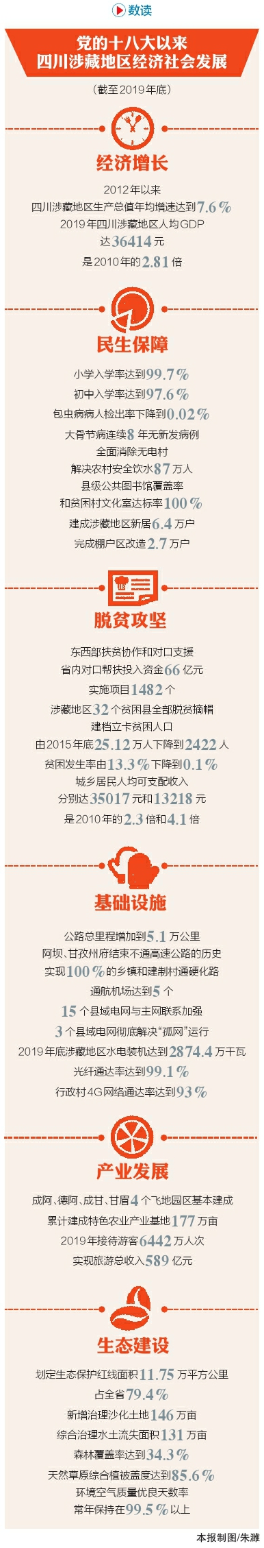省委涉藏辦相關(guān)負(fù)責(zé)人告訴記者,近年來(lái)四川省涉藏地區(qū)加快發(fā)展特色優(yōu)勢(shì)產(chǎn)業(yè),推動(dòng)全域旅游、高原農(nóng)牧業(yè)、清潔能源、民族手工藝等提質(zhì)增效。依托大熊貓、大九寨、大香格里拉、大草原等特色資源,涉藏地區(qū)大力發(fā)展全域旅游,“凈土阿壩”“圣潔甘孜”“大涼山”品牌影響力不斷提升,阿壩州、甘孜州成功創(chuàng)建首批國(guó)家級(jí)全域旅游示范區(qū),2019年接待游客6442萬(wàn)人次、實(shí)現(xiàn)旅游總收入589億元。涉藏地區(qū)重點(diǎn)發(fā)展高原牦牛、特色果蔬、釀酒葡萄、優(yōu)質(zhì)青稞、道地中藏羌藥材、野生食用菌等產(chǎn)業(yè),基本建成成阿、德阿、成甘、甘眉4個(gè)飛地園區(qū);大力推進(jìn)清潔能源建設(shè),水電裝機(jī)容量達(dá)到2875.6萬(wàn)千瓦。截至2019年底,四川涉藏地區(qū)人均GDP達(dá)到36414元,是2010年的2.81倍;城鄉(xiāng)居民人均可支配收入分別達(dá)到35017元、13218元,接近全省平均水平,向2020年底實(shí)現(xiàn)全面同步小康邁出了堅(jiān)實(shí)一步。