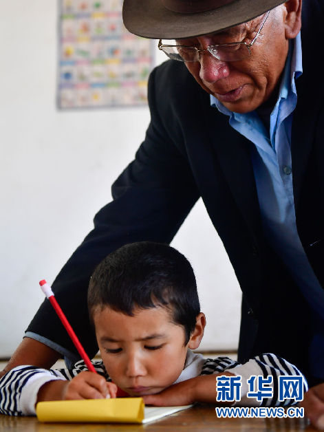 8月31日,在來(lái)塘村學(xué)校,完么仁增老師在指導(dǎo)一年級(jí)學(xué)生馬文輝學(xué)習(xí)。新華社記者 張龍 攝