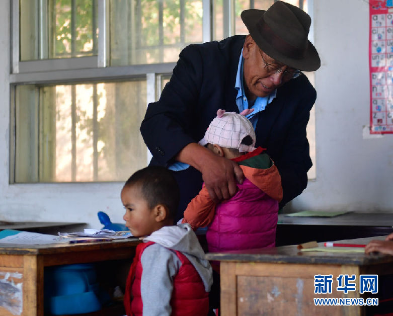 8月31日,在來(lái)塘村學(xué)校,完么仁增老師在上課前將學(xué)前班的孩子馬玲抱到椅子上。新華社記者 張龍 攝