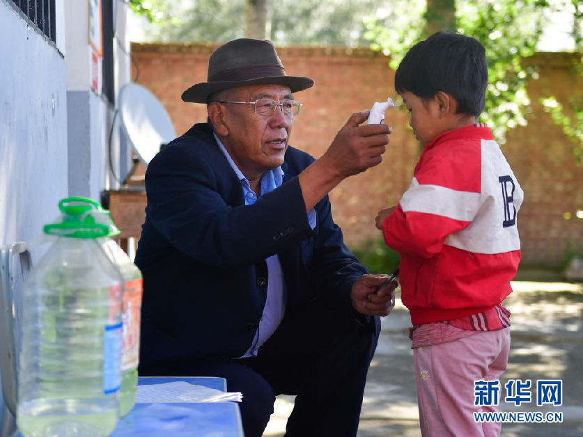 8月31日,在來(lái)塘村學(xué)校,完么仁增老師在給前來(lái)上課的孩子量體溫。新華社記者 張龍 攝