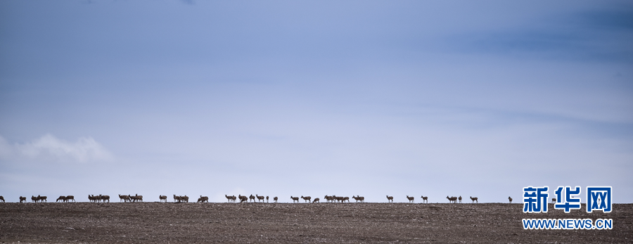 青海可可西里地區(qū),一群雌性待產(chǎn)藏羚羊通過青藏公路后向卓乃湖行進(jìn)(2016年6月7日攝)。新華社記者 吳剛 攝