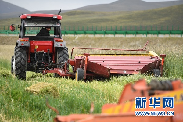 格多村村民新初駕駛打捆機(jī)進(jìn)行飼草料打捆。新華網(wǎng) 潘彬彬 攝