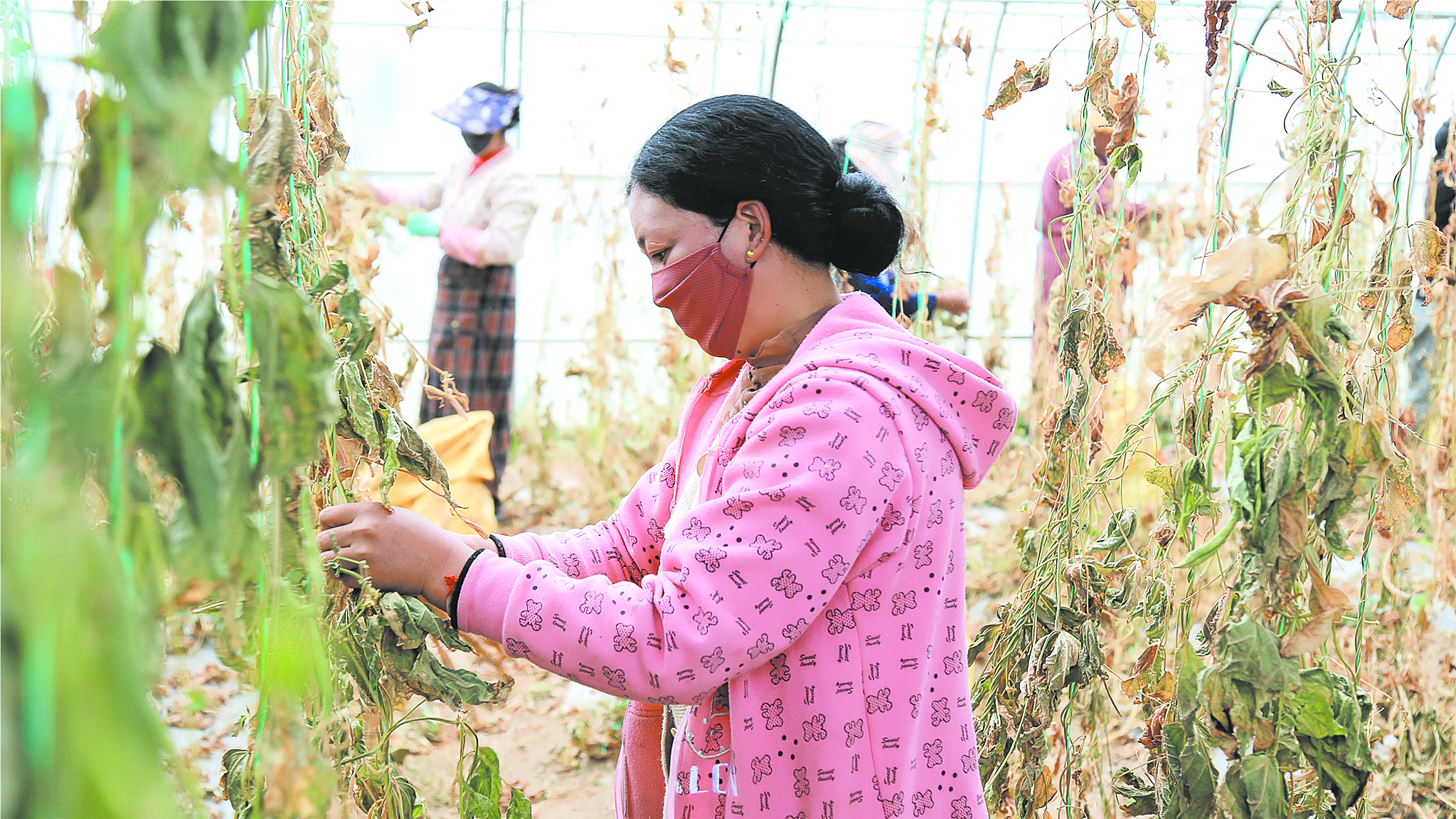 正是收獲時節(jié),在種植無筋豆種的大棚里,根窮卓瑪和其他村民正把成熟后已經(jīng)枯黃的無筋豆莢從藤上摘下來。