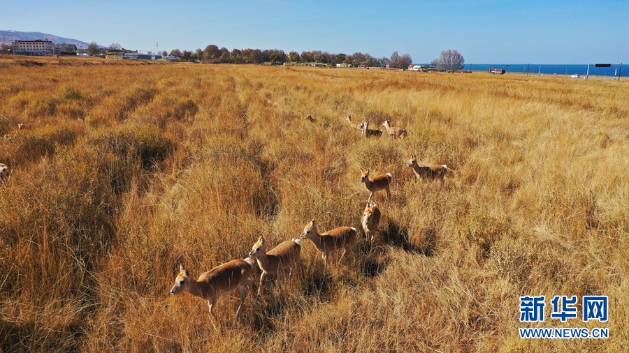 深秋時節(jié)的青海湖,芳草萋萋,遍地金黃。漫步在湖畔草原上的普氏原羚,幾乎與金黃的牧草融為一體。它們時而跳躍、時而奔走,就像湖邊一群群舞動的精靈。
