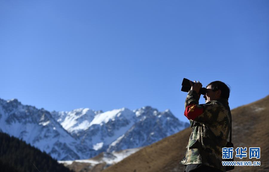 12月8日,祁連山國家公園扎麻什管護站生態(tài)管護員周曲才郎巡查途中使用望遠鏡。新華社記者 張宏祥 攝