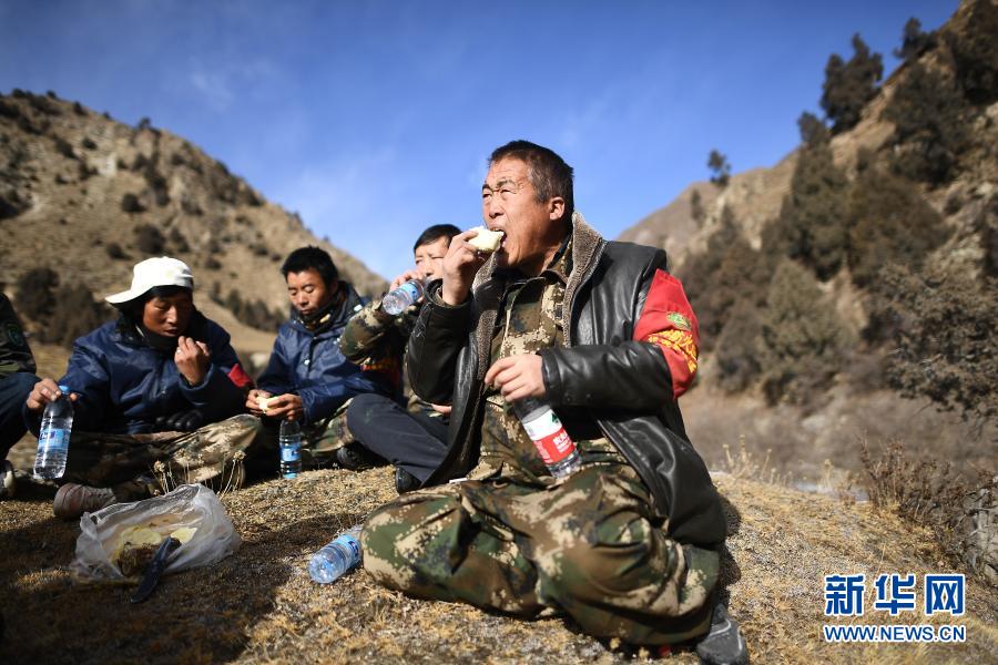 12月8日,祁連山國家公園扎麻什管護站生態(tài)管護員昂毛什加(右一)和同伴在吃午餐。新華社記者 張宏祥 攝