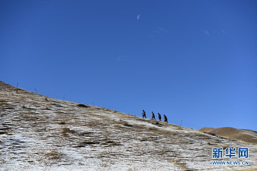 12月8日,祁連山國家公園扎麻什管護站生態(tài)管護員昂旦才讓(右一)和同伴們在巡護途中。新華社記者 張宏祥 攝