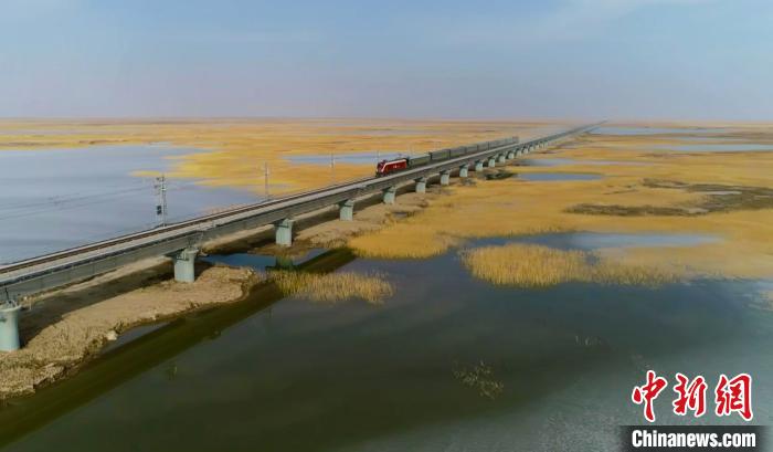 列車經(jīng)過臺(tái)特瑪湖特大橋。若羌縣融媒體中心供圖