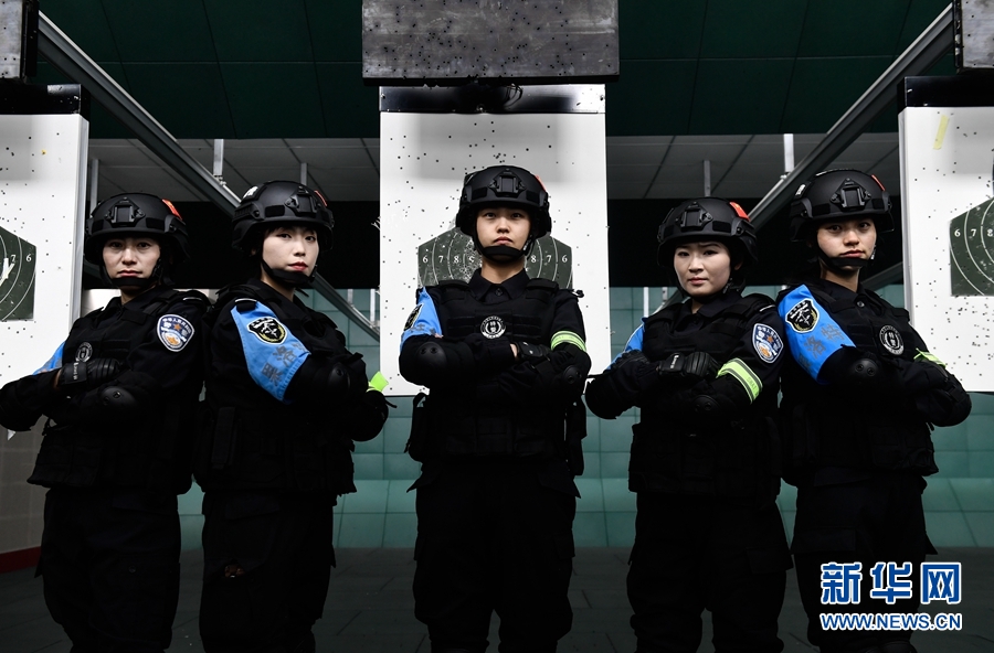 1月9日,青海省果洛藏族自治州公安局特警支隊直屬女子中隊的隊員在射擊訓(xùn)練館合影。新華社記者 張龍 攝