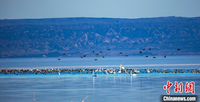 圖為上萬只野生鳥類在湖中游蕩。烏席勒 攝