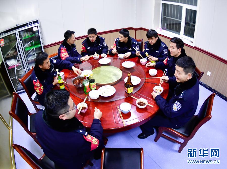 2月4日,沱沱河站派出所民警在吃餃子。新華社記者 張龍 攝
