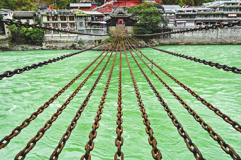 瀘定橋始建于清康熙四十四年(1705年),是大渡河上建造最早最長的一座橋梁,橋身由十三根鐵鏈組成,下邊九根作為底鏈,兩邊四根作為扶手,橋長101.67米,橋?qū)?米,由12164個鐵環(huán)組成,十三根鐵鏈重達(dá)21噸。