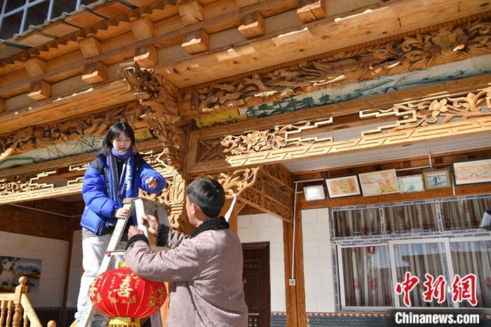 圖為格桑卓瑪在與藏族小伙一起掛燈籠迎接春節(jié)。中新社記者 劉冉陽 攝