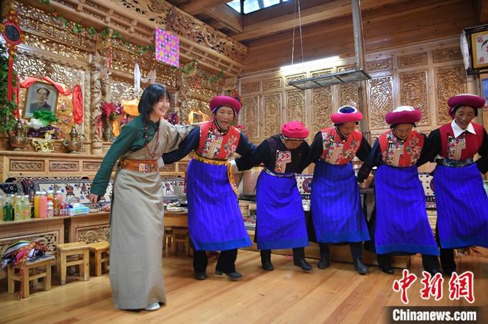 圖為飯后,格桑卓瑪(左一)與大家圍成一圈唱歌跳舞。中新社記者 劉冉陽 攝