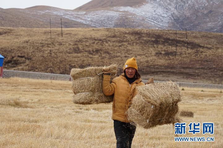 在青海省果洛藏族自治州甘德縣江千鄉(xiāng),牧民在搬運(yùn)飼草(2020年11月3日攝)。新華社記者 解統(tǒng)強(qiáng) 攝