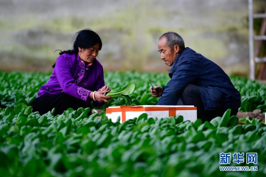 3月14日,在青海省果洛藏族自治州農(nóng)牧業(yè)生態(tài)科技示范園內(nèi),菜農(nóng)李華軍(右)與尼瑪措毛在采摘蔬菜。新華社記者 張龍 攝