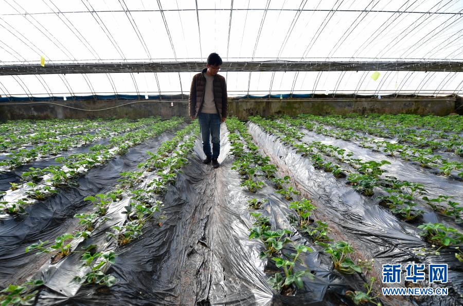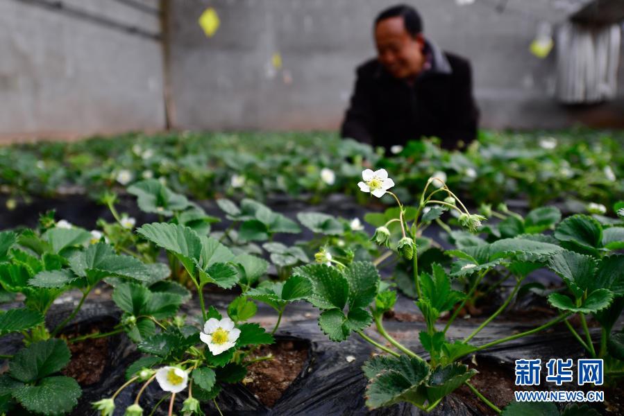 3月14日,在青海省果洛藏族自治州農(nóng)牧業(yè)生態(tài)科技示范園內(nèi),農(nóng)業(yè)技術(shù)員宋建東在查看草莓生長情況。新華社記者 張龍 攝