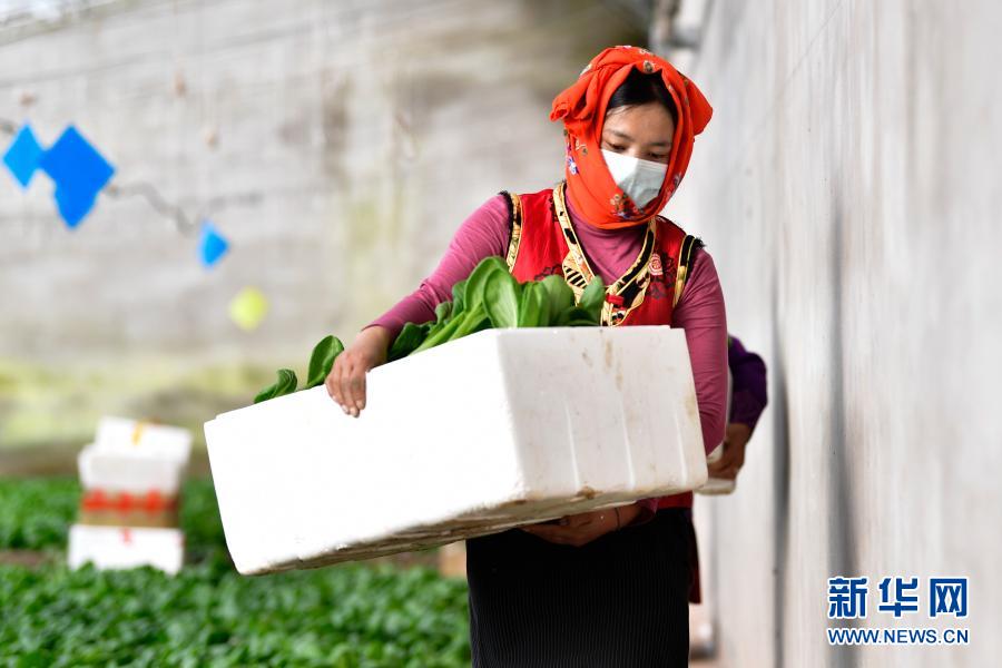 3月14日,在青海省果洛藏族自治州農(nóng)牧業(yè)生態(tài)科技示范園內(nèi),菜農(nóng)桑吉卓瑪在搬運(yùn)蔬菜。新華社記者 張龍 攝