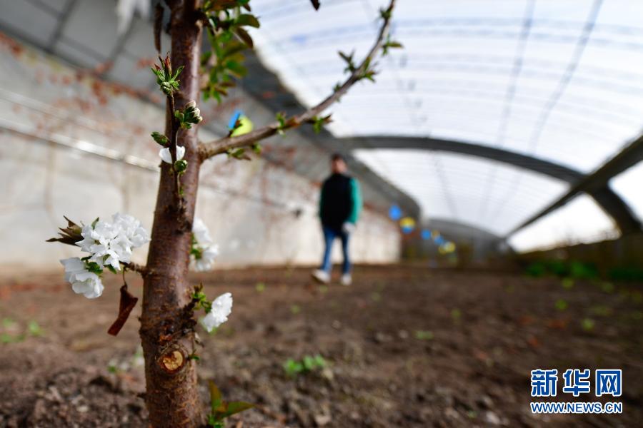 3月14日,在青海省果洛藏族自治州農(nóng)牧業(yè)生態(tài)科技示范園內(nèi),農(nóng)業(yè)技術(shù)員冷治在櫻桃樹種植棚內(nèi)工作。新華社記者 張龍 攝