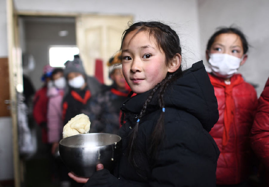 3月16日,在索加鄉(xiāng)寄宿小學(xué)食堂,白瑪措毛(前)和同學(xué)們一起打飯。新華社記者 張宏祥 攝