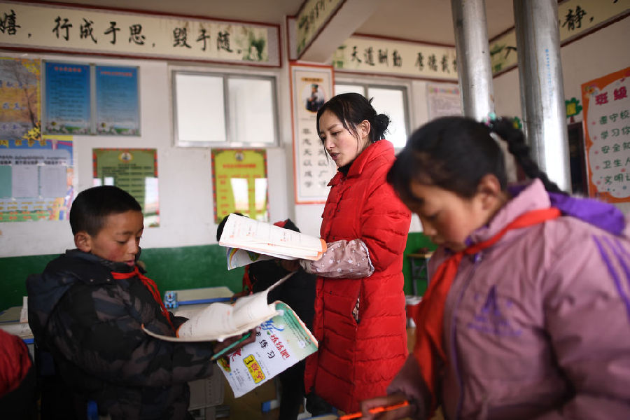 3月16日,索加鄉(xiāng)寄宿小學(xué)語(yǔ)文老師查日在為學(xué)生上課。新華社記者 張宏祥 攝