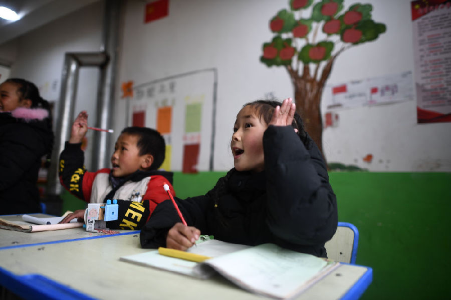3月16日,索加鄉(xiāng)寄宿小學(xué)學(xué)生白瑪措毛(右)在藏語(yǔ)文課上舉手回答問題。新華社記者 張宏祥 攝