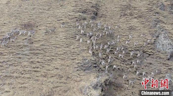 圖為航拍巖羊群在山坡上活動(dòng)。曹民鍇 攝