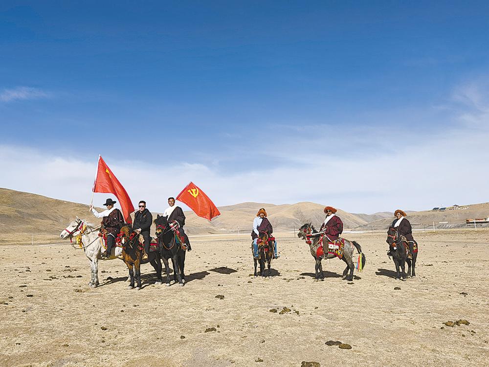 在玉樹(shù)藏族自治州曲麻萊縣葉格鄉(xiāng)龍麻村,一陣馬蹄聲由遠(yuǎn)而近,牧民江措趕忙放下手中的活從帳篷里探出頭來(lái),定睛一看,幾個(gè)熟悉的身影進(jìn)入視線(xiàn)。走在最前面的干部手拿一面鮮紅的黨旗隨風(fēng)飄動(dòng),江措激動(dòng)地向大家打起了招呼。