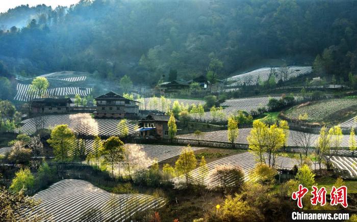 4月的四川雅安市寶興縣磽磧藏族鄉(xiāng),山坡上整齊有序的地膜,錯落有致鋪在藏寨林間,構成了一幅田園山水與天人合一的自然畫卷。