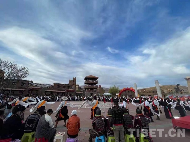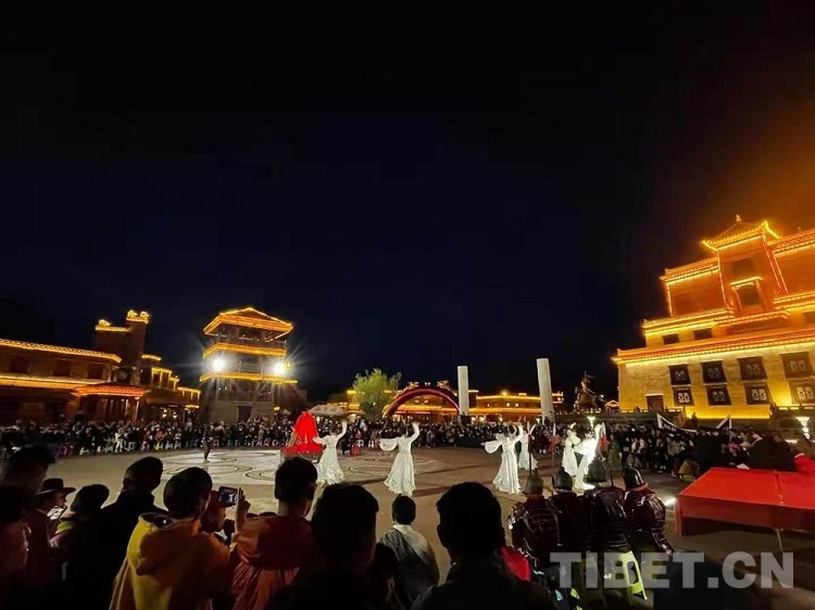 圖為四川省甘孜州甘孜縣格薩爾王城文化廣場(chǎng)上的歌舞表演
