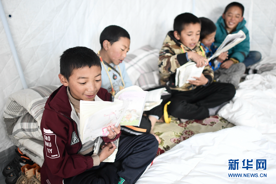 5月22日,在瑪多縣黃河鄉(xiāng)寄宿制學(xué)校救災(zāi)安置點(diǎn),孩子們在讀書。新華社記者 薛玉斌 攝