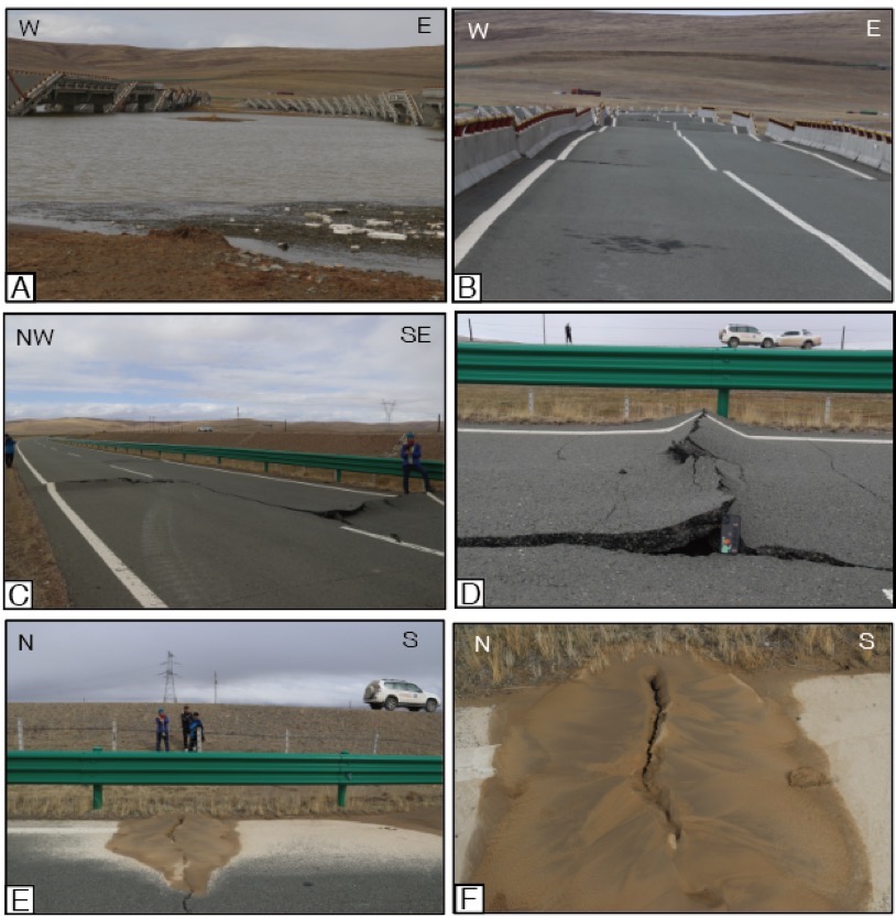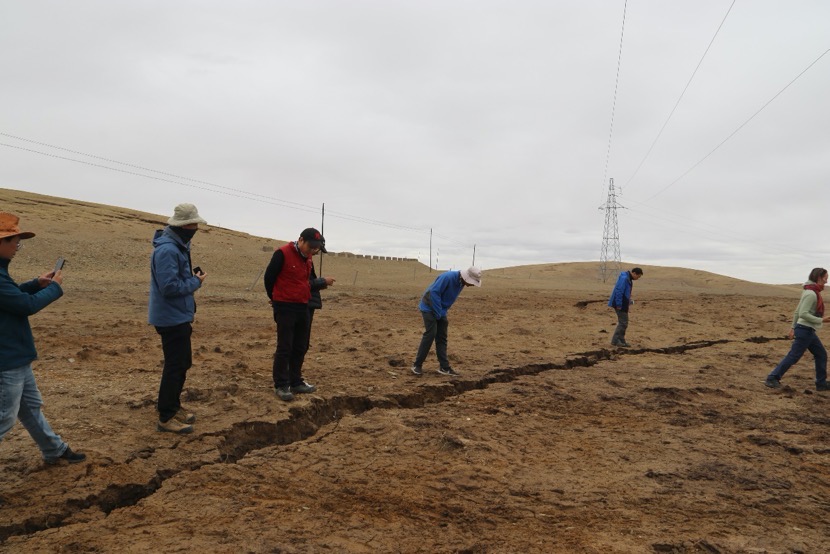 應(yīng)急考察隊(duì)相關(guān)負(fù)責(zé)人介紹,考察隊(duì)在白瑪納村附近發(fā)現(xiàn)地震次生破裂多處,黃河鄉(xiāng)附近向北西二十多公里地表破壞較為嚴(yán)重,破裂帶整體走向近120度,沿線隨處可見(jiàn)張裂隙、砂土液化等現(xiàn)象,路旁電線桿傾斜嚴(yán)重。接近G214國(guó)道一處地表破裂切過(guò)公路形成最大左行位錯(cuò)量。根據(jù)野外現(xiàn)象觀察,斷裂具有左行走滑兼正斷的運(yùn)動(dòng)學(xué)特性。
