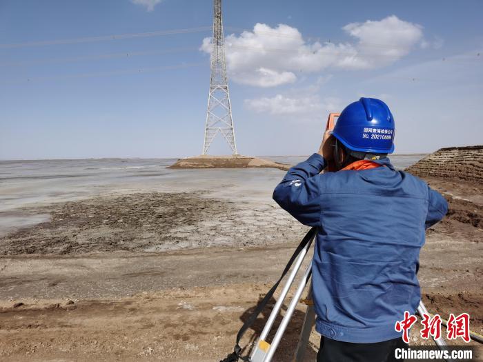 圖為“電力天路”青藏聯(lián)網(wǎng)工程運維人員觀測線路基礎沉降情況。李杰 攝