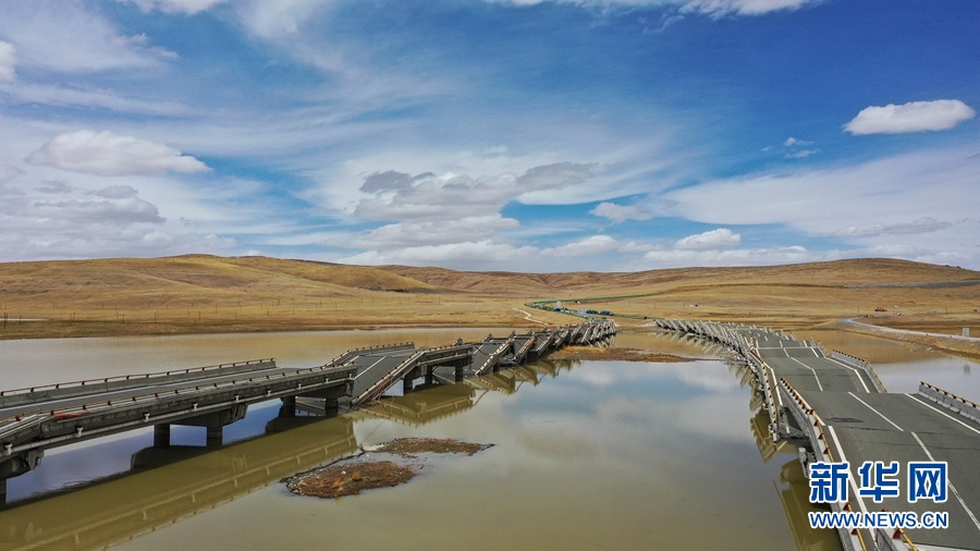 5月22日瑪多地震造成G0613西麗高速野馬灘大橋雙向坍塌。圖為5月26日航拍的野馬灘大橋。