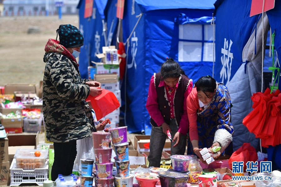 為穩(wěn)定市場秩序,方便居民生活,瑪多縣市場監(jiān)督管理局從5月23日開始,搭建臨時(shí)帳篷市場,服務(wù)群眾。5月26日,兩名受災(zāi)群眾在瑪查理鎮(zhèn)安置點(diǎn)的帳篷超市選購商品。
