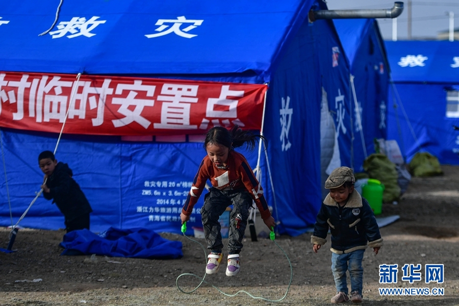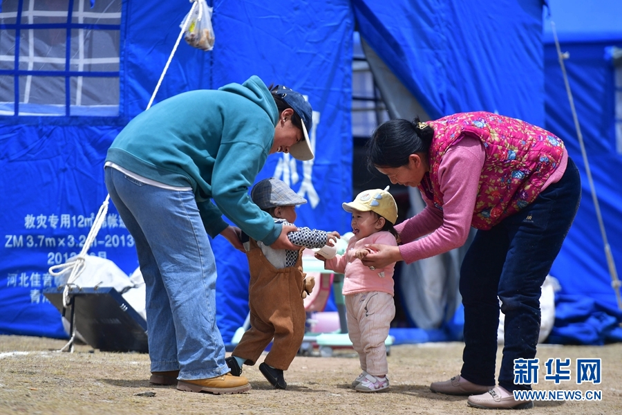 5月26日,三名小朋友在瑪多縣瑪查理鎮(zhèn)安置點(diǎn)內(nèi)玩耍。
