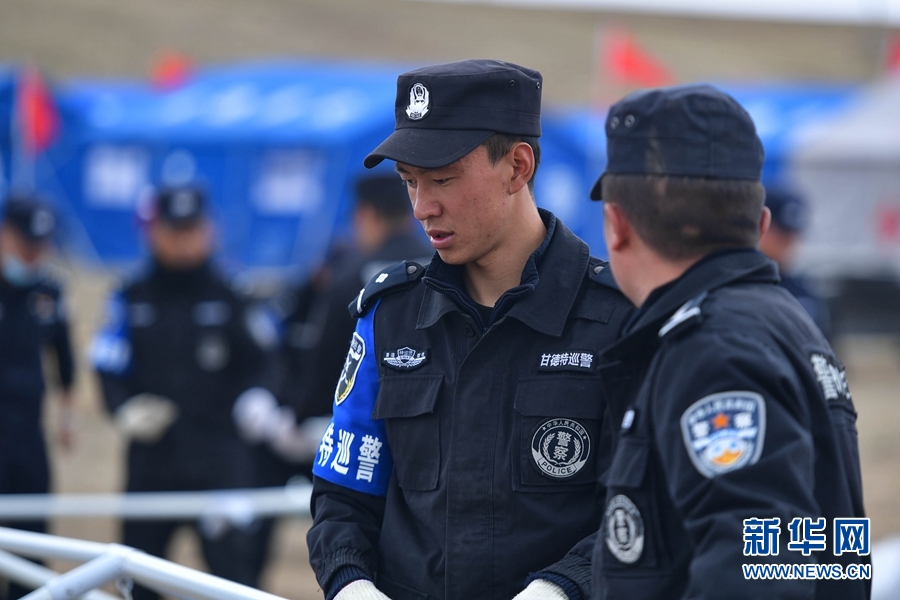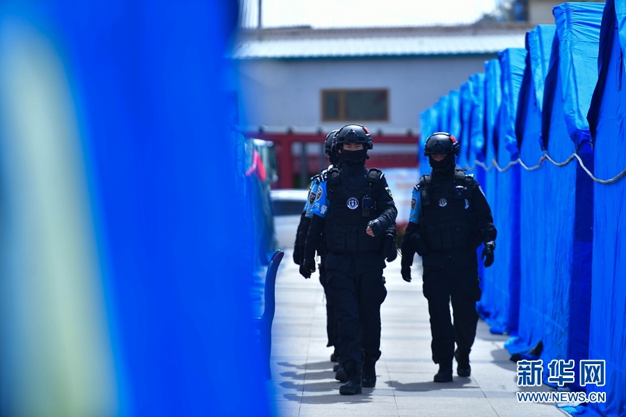 5月26日,果洛州公安局特警支隊(duì)的特警在瑪多縣縣政府廣場臨時(shí)安置點(diǎn)內(nèi)巡邏。