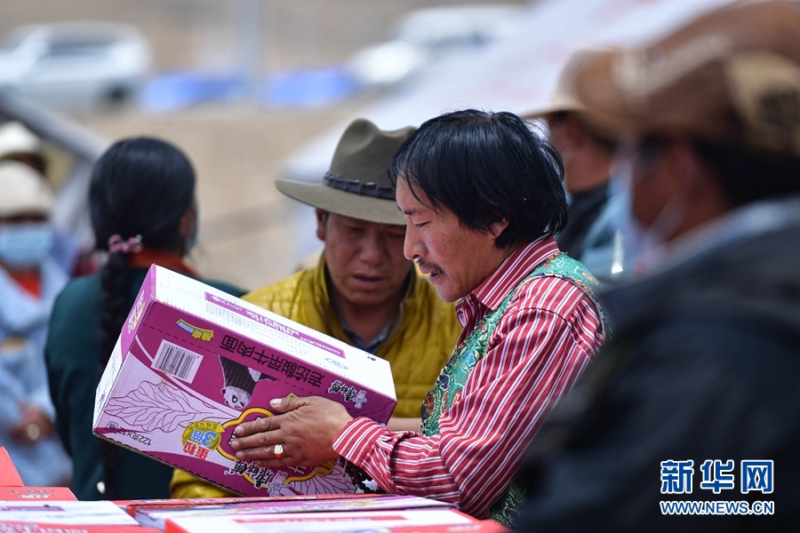 5月26日,瑪多縣扎陵湖鄉(xiāng)安置點(diǎn)內(nèi)受災(zāi)群眾在領(lǐng)取救災(zāi)物資。