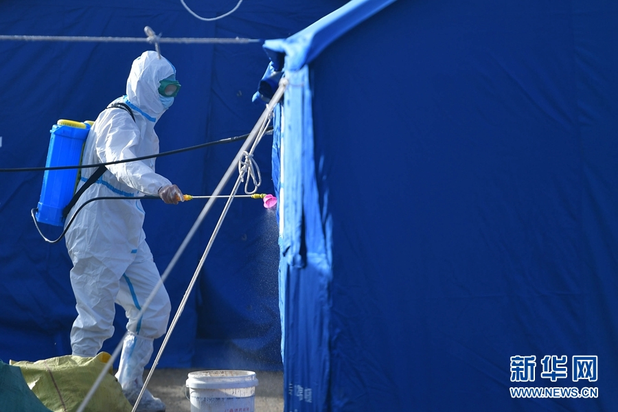 5月26日,一名工作人員在瑪多縣黃河鄉(xiāng)安置點(diǎn)內(nèi)進(jìn)行消殺作業(yè)。