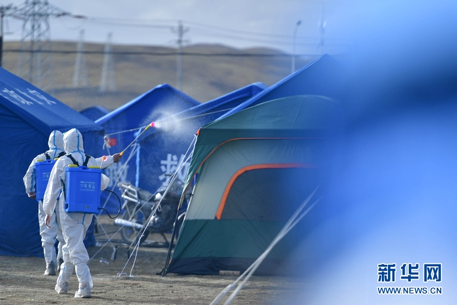 5月26日,兩名工作人員在瑪多縣黃河鄉(xiāng)安置點(diǎn)內(nèi)進(jìn)行消殺作業(yè)。