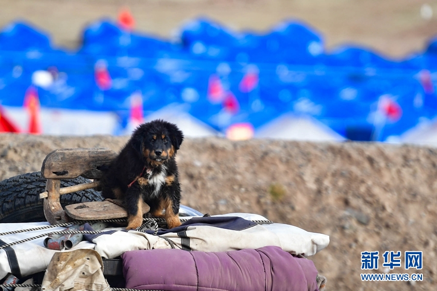 5月26日,一名受災(zāi)群眾將家中的物資和狗狗拉至瑪多縣黃河鄉(xiāng)安置點(diǎn)。