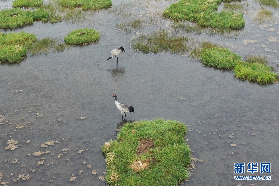 這是6月2日在甘肅省甘南藏族自治州碌曲縣尕海湖拍攝的國家一級保護動物黑頸鶴。新華社記者 杜哲宇 攝