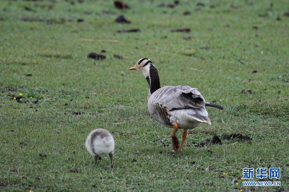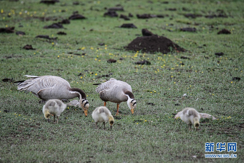 這是6月2日在甘肅省甘南藏族自治州碌曲縣尕海湖拍攝的斑頭雁及其幼鳥。新華社記者 杜哲宇 攝