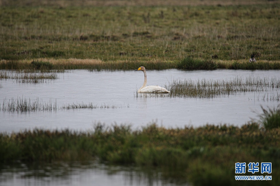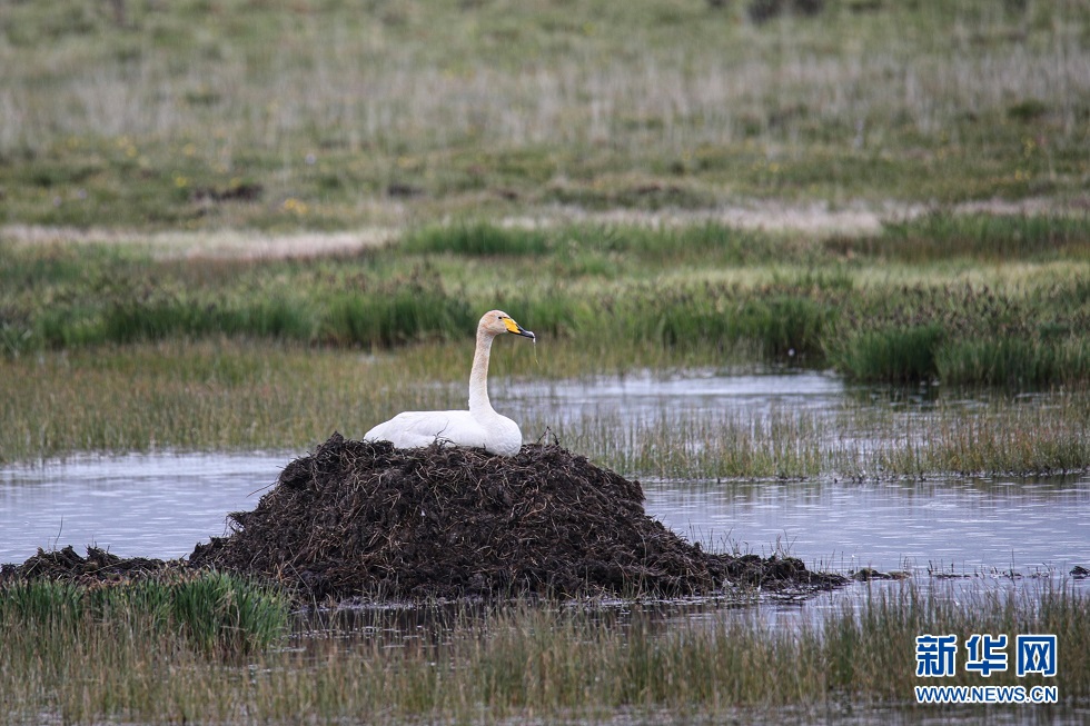 這是6月2日在甘肅省甘南藏族自治州碌曲縣尕海湖拍攝的國家二級保護動物大天鵝。新華社記者 杜哲宇 攝
