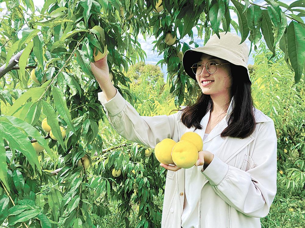 游客采摘黃桃。