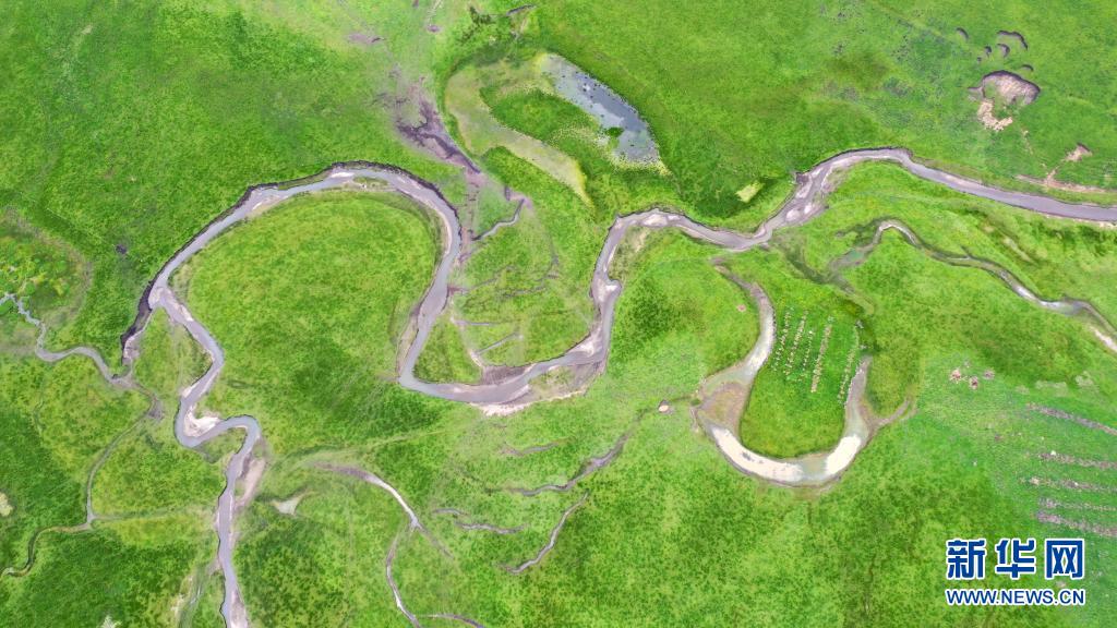 這是7月15日拍攝的瑪曲縣阿萬(wàn)倉(cāng)濕地(無(wú)人機(jī)照片)。新華社記者 文靜 攝
