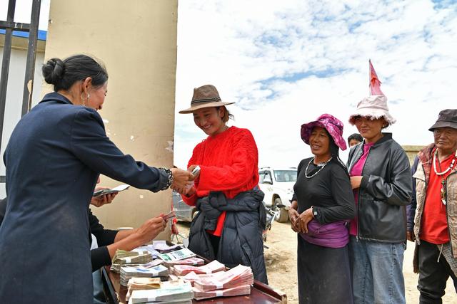 圖為藏族農(nóng)牧民在領(lǐng)勞務(wù)收入。新華社記者 李鑫 攝